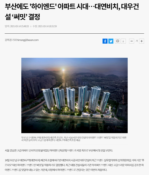 부산일보 2021년 3월 14일자 대연4구역 브랜드 관련하여 기존 '푸르지오'에서 하이엔드 브랜드인 '써밋'으로 결정된 기사가 게재되었습니다.